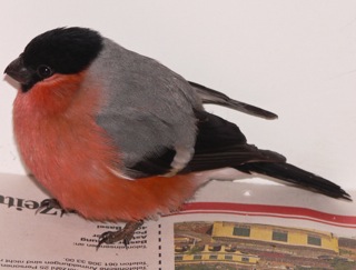 15.12.10: Die Dame rief abends an und erzählte von einem Vogel, sie vermute ein Gimpel. Der Sohn fand ihn auf dem Heimweg am Boden sitzend. Später abends brachte sie ihn mir nach Muttenz, er atmete teils schwer, das hatte er bei der Dame schon gemacht.