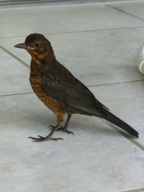 Dann sitzt hier noch eine Jungamsel, die "Gundeli-Amsel", auch Rambo genannt. Kam recht klein bei mir an, entwickelte sich erstaunlich gut, nun wo sie aber rumhüpfen will, stellte sich heraus, dass ihr eines Bein lahm ist. Bisher kommt sie damit gut klar, mal schauen, wie sich das weiter entwickelt.
